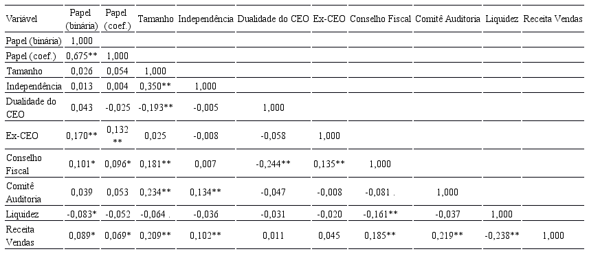 A maior parte das correlações é fraca (|coeficiente de correlação| < 0,3) e estatisticamente não significativa (p-valor > 0,10) quando testada a hipótese nula de coeficiente de correlação igual a zero. Embora o tamanho seja significativamente correlacionado com a maioria das demais, possui associação mediana apenas com a métrica de conselheiros independentes.