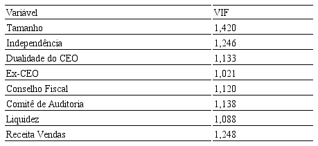 Coerentemente às correlações apresentadas e conforme apresentado na Tabela 4, não há variáveis com VIF superior a 5,000, de forma que não há indícios fortes de multicolinearidade. Havendo um número igual de observações por ano, o painel pode ser caracterizado como balanceado.