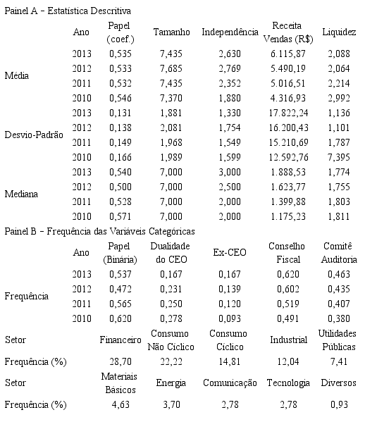 A pesquisa documental consistiu na avaliação de documentos oficiais das empresas, notoriamente as ARCA e os FR. Para a determinação da amostra, considerou-se o conjunto das empresas continuamente listadas no segmento de listagem do Novo Mercado da BM&FBOVESPA no período entre 2010 e 2013. Dentre essas, foram eliminadas as que apresentaram insuficiência de dados por não apresentação dos documentos necessários, restando 108 das 131 firmas listadas e, dessa forma, os dados podem ser dispostos como um painel balanceado.