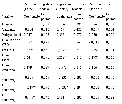 Os modelos divergem quanto à importância da presença de um Conselho Fiscal: os indicadores da Regressão Logística pooled e da Beta sugerem que a presença do CF é um diferencial significativo para a adoção do papel gerencial, enquanto o painel logístico apresenta fraca evidência desse ponto. Esse último, em um design two-way, também indica que a independência dos conselheiros pode ser um fator relevante.