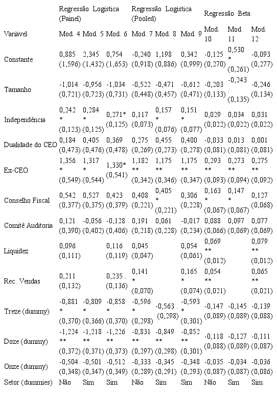 A Tabela 7 apresenta os resultados das Regressões Logística em painel com efeitos aleatórios e na forma pooled e da Regressão Beta. Assim, os resultados são convergentes quanto à importância do ex-presidente e para a ausência de significância das variáveis Tamanho, Dualidade do CEO e Conselho de Auditoria.