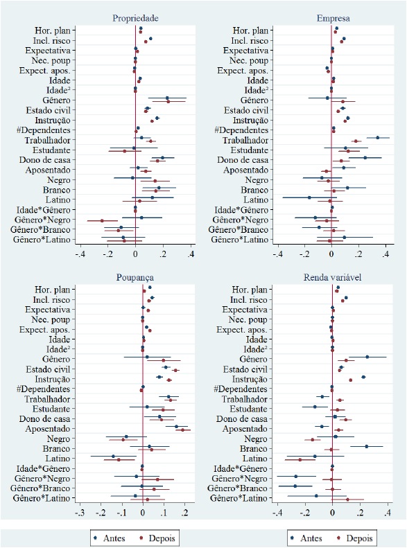 Esta figura ilustra o efeito marginal (Williams, R. (2012). Using the margins command to estimate and interpret adjusted predictions and marginal e effects. The Stata Journal, 12(2), 308-331) de cada variável explicativa sobre a propensão a investir em diferentes ativos financeiros: Propriedade de imóveis, sociedade em empresas, Poupança e ações, respectivamente no sentido horário.