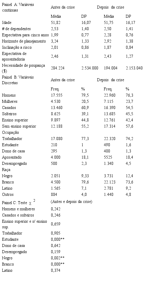 Após o período mais grave da crise, em 2013, a situação geral pouco se alterou. Em essência, o horizonte de planejamento ficou entre os próximos cinco ou dez anos, com necessidade estimada de poupança para emergências futuras ao redor de 194 mil dólares. Com relação ao perfil dos participantes, a maioria foi de indivíduos do sexo masculino, casados, sem ensino superior, trabalhadores e de cor branca, para os dois anos da pesquisa (2007 e 2013).