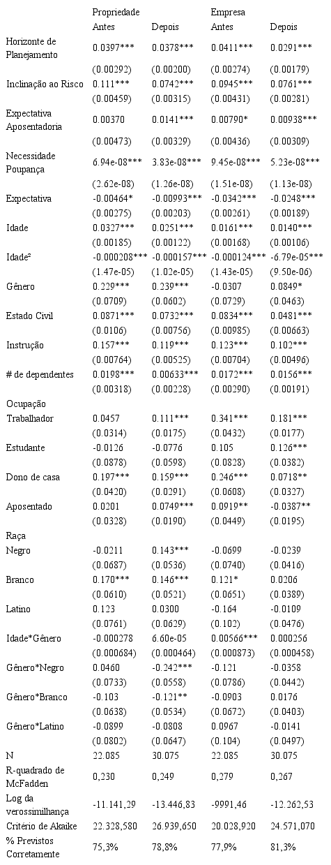 Para 2013, a expectativa para o futuro aumentou seu impacto marginal na probabilidade em 2%. Enquanto em 2007 ser Dono de casa diminuía a probabilidade em 11%, em 2013 aumentava essa probabilidade em 22%, mostrando uma mudança de comportamento desses indivíduos. Entre os termos de interação, deve-se destacar que o coeficiente de Idade.Gênero foi significante e negativo para os dois períodos. Esse resultado sugere que, quanto maior a idade do indivíduo, menor a sua propensão a aderir a um plano de aposentadoria.