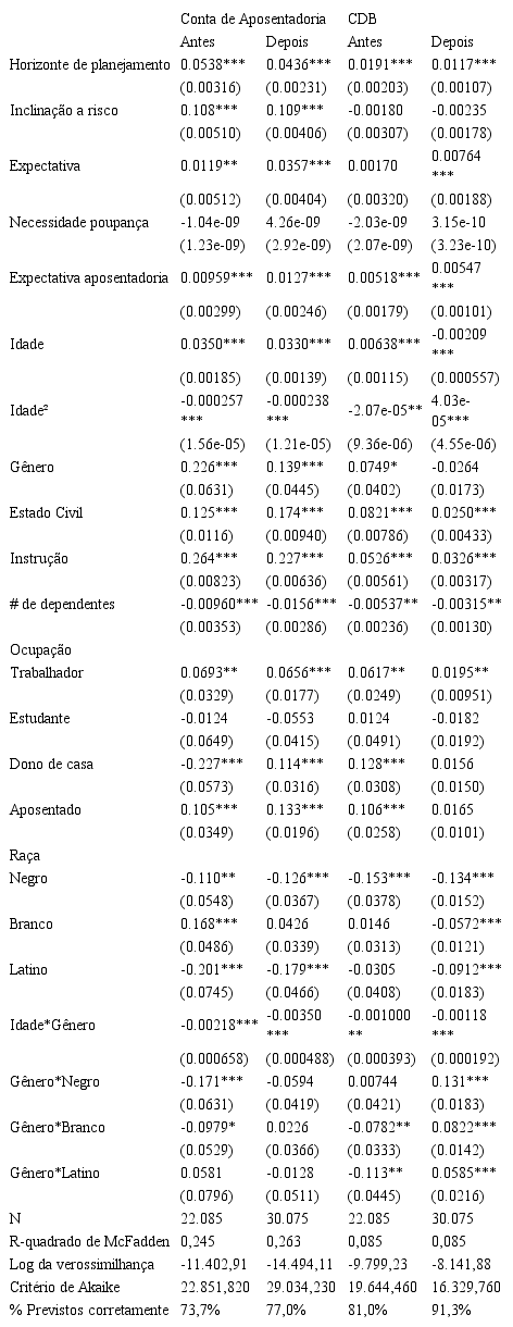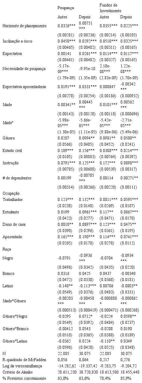 Fonte: Elaborado pelos autores com base nos cálculos realizados.Destaca-se ainda que a raça se tornou relevante. Ou seja, os resultados sugerem que indivíduos negros, brancos e latinos reduziram sua propensão a adquirir CDB’s como modo de investimento, além da expectativa acerca da economia ter se tornado significante, os critérios dono de casa e aposentado não são mais relevantes para escolher esse produto. A Tabela 5 apresenta os resultados obtidos para as Conta de Poupança e os Fundos de Investimento. Neste caso, caracterizam-se como potenciais consumidores de poupança: as pessoas casadas, com ensino superior, horizontes de planejamento mais longos, maior inclinação a risco, expectativas positivas sobre as pensões de aposentadoria e não estudantes.