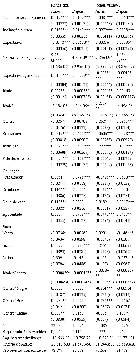 A Tabela 6 apresenta os resultados para os títulos de renda fixa e variável. Constata-se que os respondentes mais inclinados a consumir produtos de renda fixa eram predominantemente, antes da crise: brancos, casados, com ensino superior, com unidades familiares pequenas, maiores horizontes de planejamento, maior inclinação ao risco e com expectativas maiores de renda para a aposentadoria. Entre 2007 a expectativa em relação a economia diminuía a probabilidade do indivíduo em investir em renda fixa em 1%, enquanto, em 2013, aumentava em 0,6%.