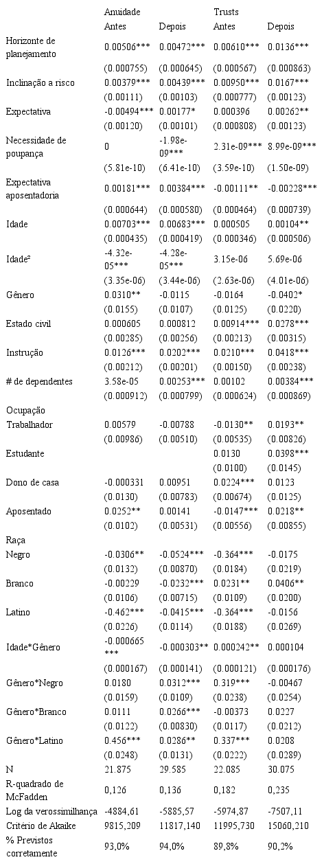 Destaca-se ainda que os termos de interação foram significantes e apontaram que os indivíduos do sexo masculino das mais diversas etnias apresentaram uma maior probabilidade em consumir o produto. Com relação aos Trusts e contas geridas por terceiros, em 2007 também não foi possível inferir acerca dos indivíduos. Em 2013, idade, gênero, casado, maior instrução, maior número de dependentes, expectativa para a economia, horizonte de planejamento, inclinação ao risco, expectativa pessimista para a aposentadoria, trabalhador, aposentado, branco e estudante passaram a ser relevantes estatisticamente.