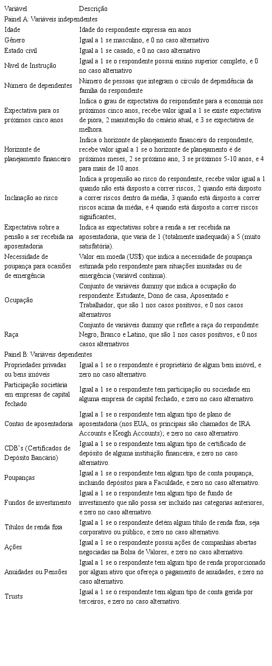 Os dados do SCF incluem informações sobre os balanços das famílias, pensões, renda e características demográficas. Nas edições de 2007 e 2013, o SCF indicou a participação de 22.085 e 30.075 respondentes, respectivamente. Para elaborar uma análise sobre as principais mudanças ocorridas nos períodos anterior e posterior à crise 2008/2009, foram testados modelos de regressão logística estimados com o emprego de variáveis selecionadas com base na literatura corrente (Finke, Howe, & Huston, 2017; Fisher, 2010; O’Neill & Xiao, 2012). A Tabela 1 apresenta as variáveis independentes e dependentes.