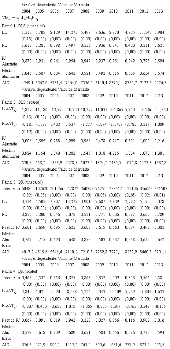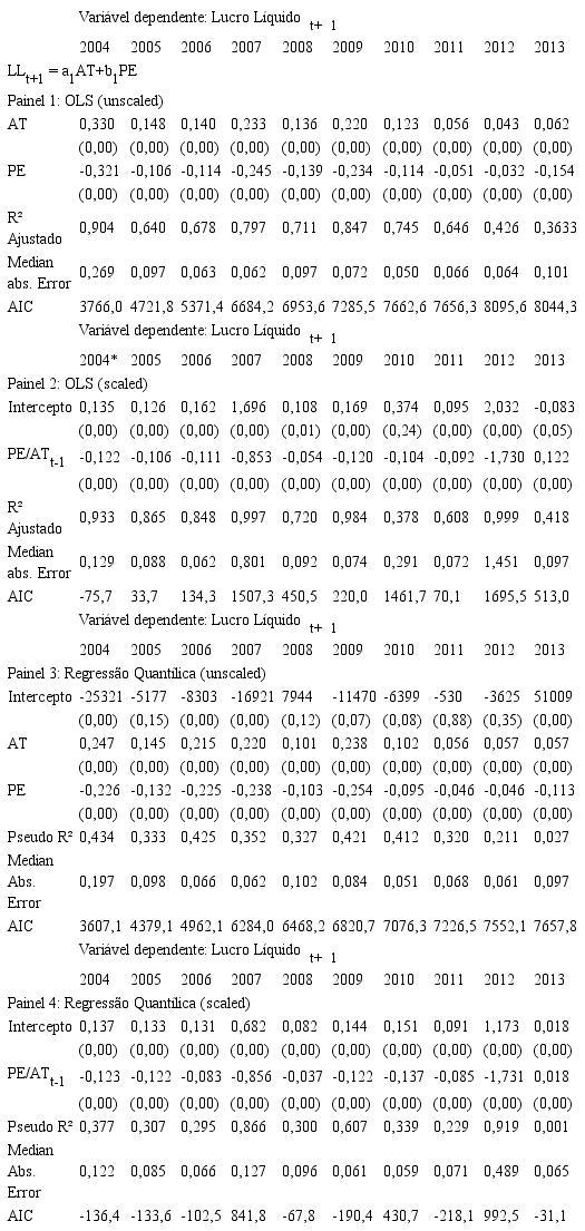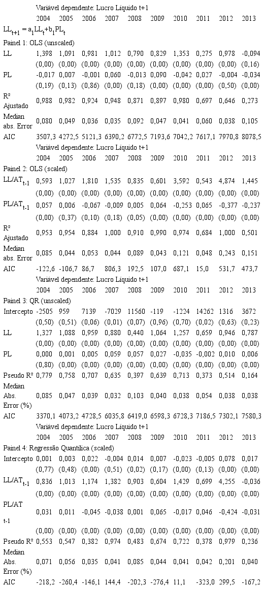 No que tange aos sinais dos coeficientes das variáveis independentes, na Tabela 4 (variável dependente lucro líquido em t+1), OLS unscaled (Painel 1) apontou 7 valores negativos que contradizem a teoria, enquanto que a QR unscaled (Painel 3) apresentou apenas 2 (anos de 2010 e 2011), possivelmente devido a problemas trazidos pela adoção completa das IFRS. A OLS scaled (Painel 1) obteve melhor resultado em comparação com a OLS unscaled do Painel 3, pois apontou apenas 5 erros de sinal. A estimação por QR scaled (Painel 4) auferiu, entretanto, 6 valores negativos, evidenciando uma piora perante a QR unscaled do Painel 3. Esse resultado inferior da QR scaled pode ter ocorrido em decorrência do fato de que a quantílica serve, mais adequadamente, para explorar a heterogeneidade dos dados, ao passo que, quando os dados são tratados com scale, essa informação é perdida.