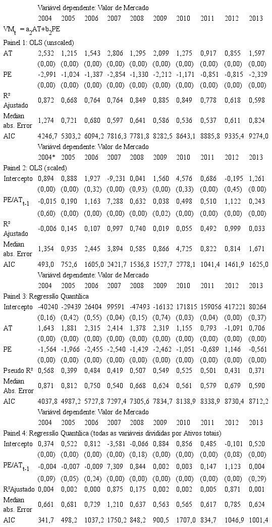 Na Tabela 2, foram obtidas maiores quantidades de erros dos direcionamentos dos sinais dos coeficientes. Lembrando que a relação teórica entre os coeficientes deve respeitar a relação a + b = 0, ou seja, o coeficiente . deve ser positivo e o b deve ser negativo em mesma proporção para satisfazer a relação. Seguindo essa linha de raciocínio, foi evidenciada uma relação divergente apresentada teoricamente no Painel 2 (Tabela 2) (OLS deflacionado pelos ativos totais em t-1 com o valor de mercado sendo a variável dependente), onde os coeficientes a. foram negativos para os anos de 2007 e 2012; enquanto que os coeficientes da variável PE/AT, na Tabela 2, apresentaram-se em valores positivos para todos os anos com exceção de 2004, portanto, contrariando a teoria e o que foi observado por Ohlson e Kim (2015).