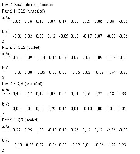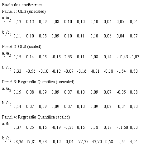 Foram realizados testes de média t para amostras independentes com o objetivo de avaliar se os valores eram diferentes entre os coeficientes a e b para OLS e QR unscaled e scaled. Os resultados, não tabulados, indicaram p-valores maiores do que 5% para todos os casos, ou seja, mostrando que os intervalos dos coeficientes tanto para a e b, para o Painel 1a e 1c não possuíam médias diferentes estatisticamente. Resultados semelhantes foram apresentados para o Painel 1b e 1d para ambos os coeficientes.