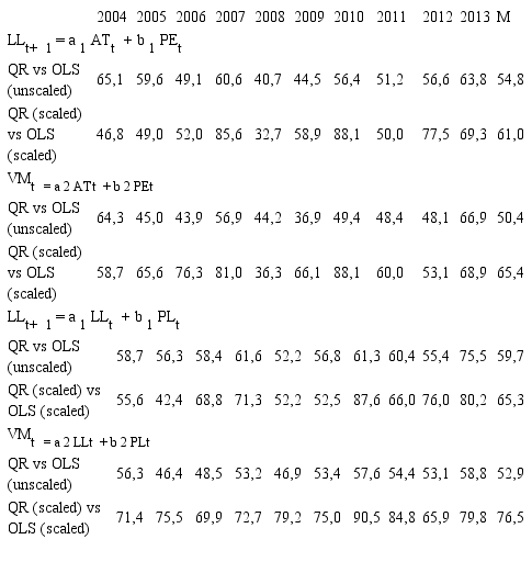 Dadas essas prerrogativas para a avaliação da qualidade dos modelos, foi observado na Tabela 7 que, para o Teste A, a QR superou em 3 comparações [para Equação (4) ambas as estimações QR e, para a equação (5), a QR scaled] no que diz respeito à quantidade de anos. Entretanto, com base na média dos anos, a QR obteve resultados satisfatórios em todas as competições.