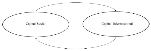 No campo do Estado em análise, o capital informacional se apresenta em duas formas principais: como informações específicas, que dizem respeito ao objetivo do programa ou órgão, e como informações sobre princípios básicos de convivência na favela. De forma geral, pode-se afirmar que aqueles programas que possuem um acúmulo menor de capital social parecem ter acesso apenas ou principalmente ao capital informacional na sua primeira forma, o que, por sua vez, dificulta o acesso ao capital social. Já os programas que possuem um acúmulo maior de capital social, como os casos da UPP Social, Territórios da Paz e CRAS, conseguem ter acesso ao capital informacional nas suas duas formas, e assim capital social e capital informacional parecem se retroalimentar, lembrando a afirmação de Bourdieu (2011) de que as espécies de capital podem ser conversíveis umas nas outras. Esta relação entre as duas formas de capital aqui descritas é ilustrada na Figura 3 a seguir: