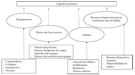 Conforme o exposto, o capital econômico acumulado pelos agentes parece se apresentar em quatro formas principais: nos equipamentos disponíveis, no efetivo de funcionários, nos salários dos funcionários e nos recursos disponíveis para a realização das atividades. Para acumular o capital econômico, os agentes podem conseguir transferências diretas de recursos via governo que, em geral, dependem da sua legitimidade.