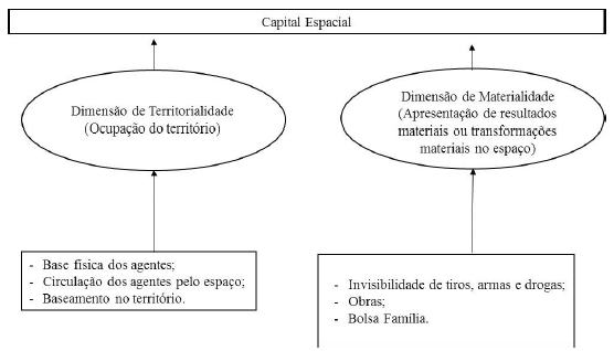 É nesse sentido que falamos aqui em um capital espacial como um capital importante no campo do Estado que se analisa. Conforme explicou Bourdieu (2011), para além das espécies de capital fundamentais, em geral presentes em todos os campos, as espécies de capital são definidas de acordo com a lógica específica de cada campo e, portanto, novos tipos de capital podem aparecer em campos distintos. No campo do Estado em ação nas favelas pode-se identificar o capital espacial como uma nova espécie de capital em jogo, que se apresenta em suas duas formas principais: em uma dimensão de territorialidade, que se dá pela ocupação dos agentes do Estado do espaço das favelas, e por uma dimensão de materialidade, que se dá pela apresentação de resultados materiais ou de transformações materiais no espaço. A forma como se chegou ao conceito proposto de capital espacial, a partir dos dados, é ilustrada na Figura 5 a seguir: