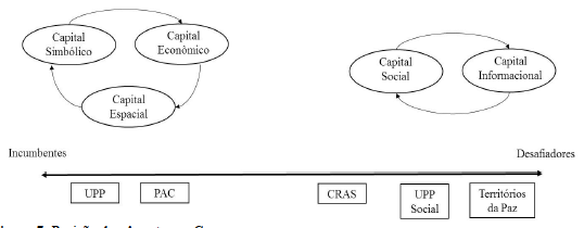 Conforme mostra a figura, CRAS, UPP Social e Territórios da Paz, com um maior acúmulo de capital social e informacional, mantêm-se como desafiadores no campo. Já UPP e PAC, com maior acesso aos capitais econômico, espacial e, consequentemente, simbólico, assumem a posição de incumbentes.