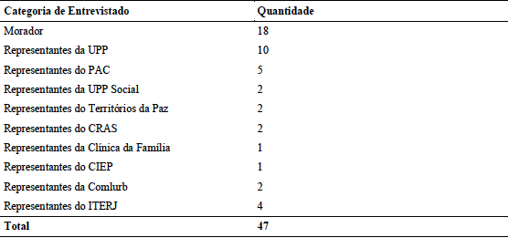 Os moradores entrevistados foram selecionados com base na observação participante, que possibilitou identificar lideranças comunitárias e moradores que tinham mais contato com os representantes do Estado que atuavam nas favelas investigadas. Os representantes do Estado entrevistados também foram selecionados com base na observação, que possibilitou identificar aqueles que atuavam diretamente na favela em questão ou ocupavam um cargo superior nos programas voltados para a favela, participando ativamente das disputas no campo.