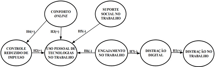 O profissional pouco engajado e insatisfeito com suas atividades pode exibir queda na sua produtividade e na sua eficácia individual (Ghani & Deshpande, 1994; Maslach & Leiter, 1997), e comportar-se de modo que suas ações não tenham orientação ao trabalho ou focar em distrações. Por exemplo, pode dedicar-se à cibervadiagem, definida como a utilização indevida dos recursos tecnológicos para fins privados durante o horário de expediente (Greenfield & Davis, 2002; Whitty & Carr, 2006), ou a sua distração por meios digitais. Assim, elaboram-se as seguintes hipóteses: