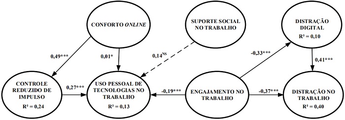 ***p < 0,001; * p < 0,05; seta tracejada (NS) = coeficiente não significante (p > 0,05).