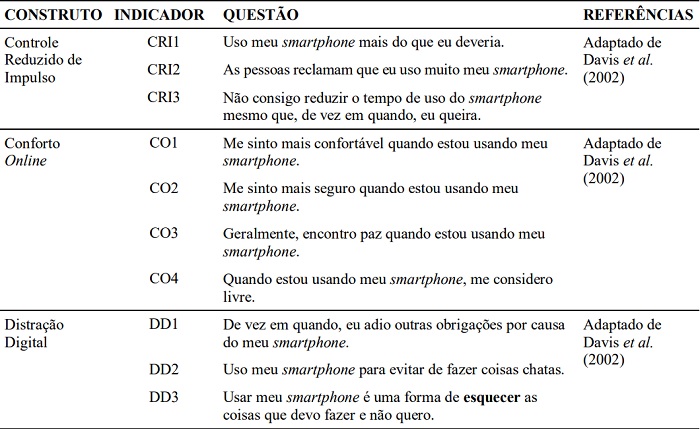 Para tanto, selecionaram-se fatores, potencialmente promotores do Uso Pessoal da TI no Trabalho, advindos de estudos que versam sobre sintomas de dependência tecnológica (Davis et al., 2002), além de aspectos que envolvem comportamento organizacional (Fredricks et al., 2004; Skinner et al., 2008) e influências sociais (Marshall et al., 2007).