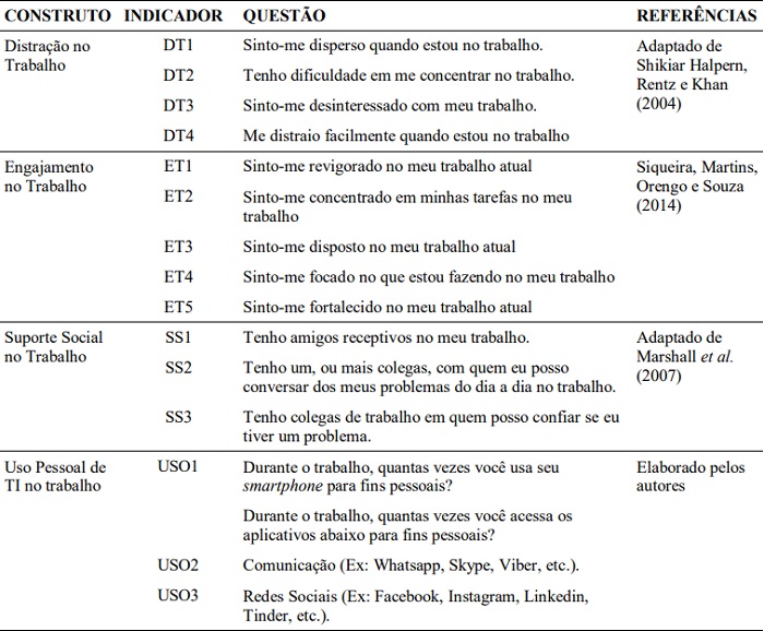 O estudo de Marshall, Michaels e Mulki (2007) resultou no desenvolvimento da escala de Isolamento no Ambiente de Trabalho, que mensura o isolamento percebido pelo profissional na organização, pelos colegas de trabalho e supervisores, além da falta de oportunidades para uma interação social e emocional com a equipe. Neste estudo, esse construto foi denominado como Suporte Social no Trabalho. Para medição da escala de Uso Pessoal de TI no trabalho, foram elaborados itens que indagavam sobre a frequência de acesso de aplicativos de comunicação, redes sociais, áudio, vídeo, jogos, entretenimento, fotos durante o expediente profissional, além da média de minutos e da frequência de acesso do smartphone para fins pessoais.