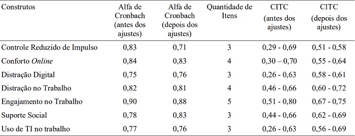 De antes da aplicação do questionário até a amostra final, e com o objetivo de observar se as pessoas que participariam da coleta de dados teriam o entendimento pleno das questões, o instrumento de medida foi aplicado, presencialmente, como pré-teste, a um grupo de 150 respondentes. Durante a primeira aplicação do instrumento, não foram manifestadas dúvidas e ambiguidades no preenchimento do questionário. Em seguida, procedeu-se análise exploratória dos indicadores pelo estudo da correlação entre os itens e da correlação item-total corrigida (CITC), que mede a correlação entre os itens do mesmo fator, determinando, assim, até que ponto os indicadores compartilham o mesmo significado (Churchill, 1979). Segundo Simsion (2007), recomenda-se a eliminação de itens que apresentem valores de CITC abaixo de 0,30. Adotando-se este critério, eliminou-se um indicador de cada um dos seguintes construtos: Distração Digital, Conforto Online, Controle Reduzido de Impulso e Uso Pessoal de Tecnologia de Informação.