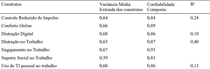 De acordo com os resultados da Tabela 3, os construtos Controle Reduzido de Impulso e Distração no Trabalho apresentaram um r² com efeito considerado alto, enquanto o construto Uso Pessoal de TI apresenta um r² com efeito considerado médio.