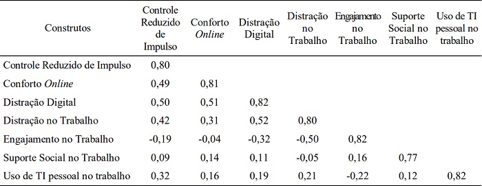 Outro indicador de validade discriminante entre os construtos é calcular a raiz quadrada da variância média extraída dos construtos. Esse valor deve ser maior que a correlação entre as variáveis latentes (Fornell & Larcker, 1981). A Tabela 3 apresenta esses valores obtidos pela amostra deste estudo. Na diagonal, em negrito, é apresentada a raiz quadrada da variância média extraída, que é superior à correlação das variáveis latentes em todos os casos.