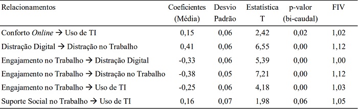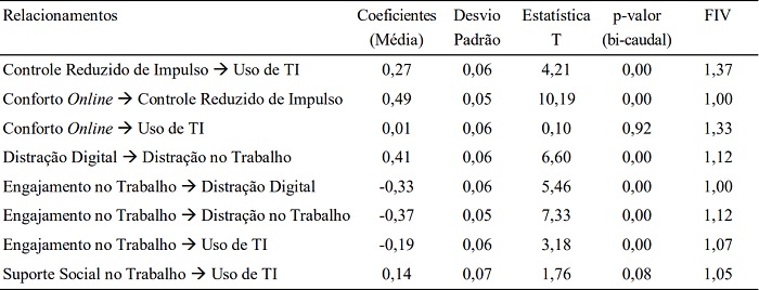 Para avaliar se existem problemas de colinearidade no modelo estrutural, foram analisados os valores do fator de inflação da variância – FIV para cada construto do modelo estrutural. Os resultados obtidos estão dentro da faixa de valores estabelecida por Hair et al. (2014), que recomenda que o FIV seja inferior a 5. Os valores de FIV dos relacionamentos entre construtos são apresentados na Tabela 5. Esta tabela também apresenta os valores dos coeficientes entre os construtos e as respectivas estatísticas t de Student. Os valores dos coeficientes também foram estimados pela técnica de bootstrapping. Todos os valores dos relacionamentos apresentaram valores de t de Student superiores a 1,96 e são considerados significantes, com exceção dos relacionamentos entre Conforto Online e Uso e entre Suporte Social no Trabalho e Uso.