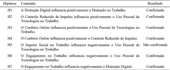 Assim, de acordo com os resultados da Tabela 5, pode-se afirmar que o Engajamento no Trabalho influencia diretamente o Uso Pessoal de TI e a Distração no Trabalho de forma negativa. Isso revela que profissionais engajados nos seus afazeres profissionais tendem a reduzir desvios de concentração e foco nas suas atividades laborais pelo uso pessoal de seus dispositivos pessoais.