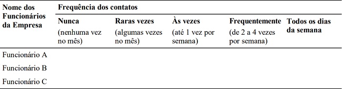 A primeira coluna do questionário contém o nome de todas as pessoas do seu departamento e das demais áreas da empresa. Marque um X na coluna que melhor descreve a frequência do seu contato com cada pessoa.