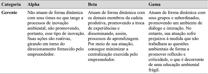 Por outro lado, esta situação pode ser revertida quando há uma atuação forte e direta por parte do gerente, uma vez que ele consegue compensar o perfil autoritário e centralizador do empreendedor por meio de sua atuação com os demais stakeholders. Em grande medida, essa situação ocorre quando esses profissionais têm formação educacional diferenciada em termos ambientais, o que possibilita que disseminem informações pelo restante da cadeia produtiva, atenuando, portanto, o papel centralizador do empreendedor.