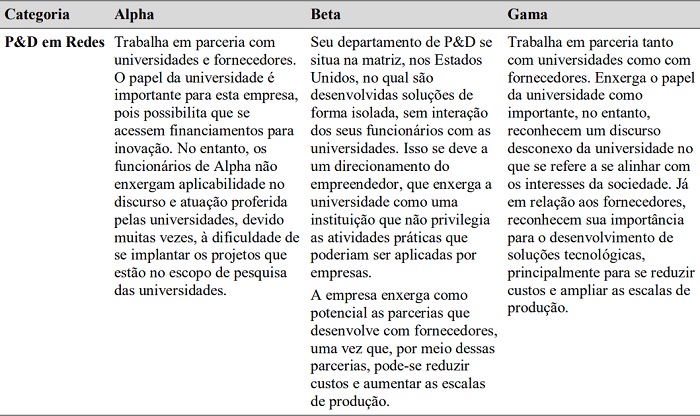 Todas as três empresas trabalham com P&D de forma colaborativa com fornecedores e, no caso de Alpha e Gama, também com universidades. Apesar de ter havido alguns projetos em parceria com o meio acadêmico que se desdobraram em inovações ambientais, as entrevistas revelaram um distanciamento de interesses entre esses dois atores, sobretudo na opinião dos gestores das empresas, pelas dificuldades de aplicação do conhecimento gerado nas instituições de ensino, além do desalinhamento de suas agendas com a agenda corporativa, fragilizando os resultados da inovação ambiental (Dlouhá, Barton, & Janousková, 2013; Fenwick, 2007; Nogueira & Odelius, 2015; Prugsamatz, 2010; Santos & Sampaio, 2016; Styles, Schoenberger, & Galvez-Martos, 2012).