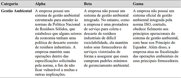 Já a categoria gestão ambiental também se apresentou como significativa em relação ao processo de aprendizagem para a inovação ambiental nas três empresas. Mesmo não havendo, por exemplo, um processo formal em Beta, a companhia atua por meio de práticas concernentes à gestão integrada, processo que, para Stoughton e Ludema (2012), representa um modelo que reforça a atitude dos indivíduos em imergir nas questões ambientais da organização.