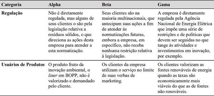 A categoria regulação se mostrou extremamente relevante para promover ambientes de aprendizagem organizacional para a inovação ambiental. Mesmo para as empresas Alpha e Beta, que não são atingidas diretamente por nenhuma imposição legal, alguns de seus clientes o são, fato que impele ajustes na cadeia produtiva (Berrone, Fosfuri, & Gelabert, 2013; De Marchi, 2012; Jacomossi et al., 2016; Marinescu et al., 2015). Dessa forma, clientes dessas empresas, no anseio de responderem às pressões regulatórias, buscam, no mercado, parceiros comerciais que estejam preparados para lidar operacionalmente com esses desafios. Um exemplo são os clientes de Alpha situados no segmento de óleos lubrificantes que, para gerenciarem as exigências da política nacional de resíduos sólidos (PNRS), contratam-na usando o produto liner em BOPP a fim de legitimar suas operações.