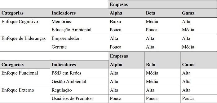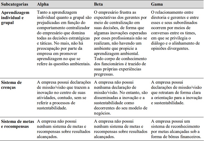 Observa-se, na Tabela 5, que em Gama há evidências de um ambiente que promove a aprendizagem em nível individual e coletivo, favorecendo, consequentemente, a construção de memórias, o que não se dá em Alpha e Beta, uma vez que o comportamento centralizador dos empresários não promove esse tipo de desenvolvimento. Situação como essa já foi comentada por Cheng et al. (2014), em que o comportamento centralizador do empresário limita o desenvolvimento de ambientes de inovação ambiental.