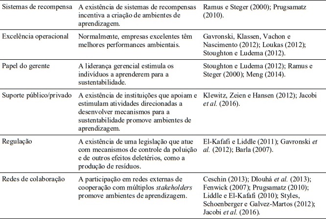 Para Siebenhüner e Arnold (2007), há uma percepção por parte dos defensores da sustentabilidade de que ela deve ser trabalhada nas organizações como quadro subjacente ao da aprendizagem organizacional, já que ambas possuem fluxos e modelos mentais comuns. Velázquez, Esquer e Munguía (2011) comentam que uma organização que aprende para a sustentabilidade é caracterizada por gerar um conhecimento que modifique suas práticas de forma a diminuir e/ou suprimir os riscos relativos às suas operações. esquisas nesta temática, no entanto, são ainda incipientes, conforme estudo bibliométrico desenvolvido por Cortês e Rodrigues (2016), ainda que seja possível identificar na literatura um conjunto de fatores que estimulam a aprendizagem para sustentabilidade nas organizações, conforme Tabela 2.
