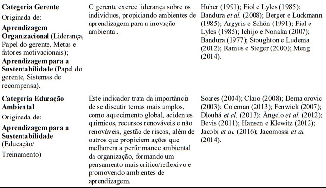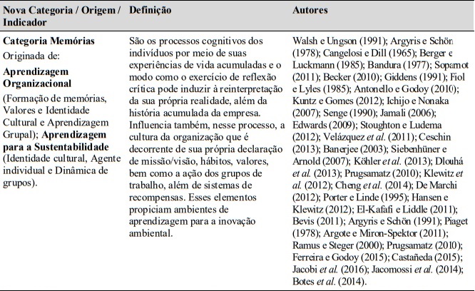 Vale frisar a importância da categoria memórias, representada pelas subcategorias aprendizagem individual e grupal, além do sistema de metas, recompensas e crenças da organização, também reconhecido como importante instrumento para a disseminação de ambientes de aprendizagem. A incorporação dos valores ambientais nas declarações de missão/visão, além das experiências acumuladas em torno da temática ambiental (Jacobi et al., 2016), alimenta a história da organização na direção de outras inovações sob a mesma dimensão (Nelson & Winter, 1982), reforçando o processo de transferência da memória organizacional, conforme postula Becker (2010).