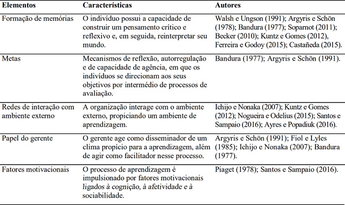 Percebe-se que as dimensões explicitadas na Tabela 1 se situam tanto em esferas subjetivas do indivíduo, como a formação de memórias, fatores motivacionais e a existência de metas, quanto em esferas decorrentes de processos de interação, como a atuação do gerente e os contatos com redes externas. Outros elementos também se apresentam importantes ao processo de aprendizagem organizacional, como a própria cultura de aprendizado, uma abordagem estratégica que contemple a necessidade de políticas de aprendizagem nas organizações, a formação das pessoas e o suporte organizacional (Beyene, Shi, & Wu, 2016; Castañeda, 2015).