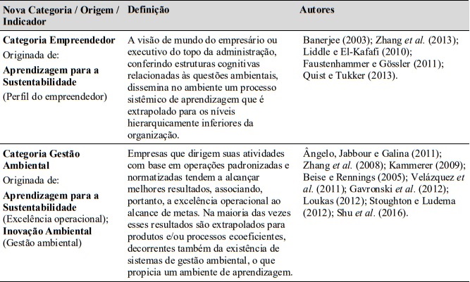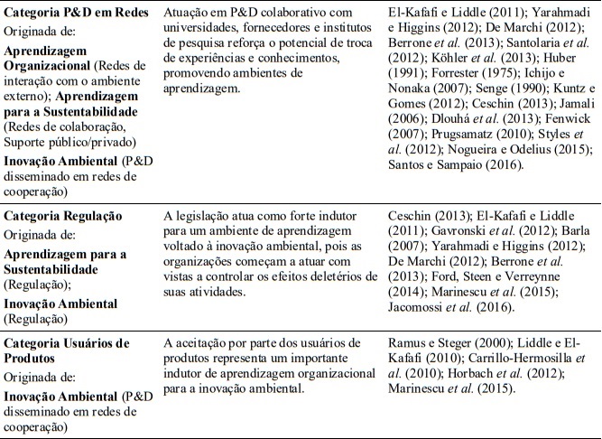 Na elaboração da Figura 1, buscou-se agrupar os principais pontos levantados pela literatura e, em seguida, propor uma nova referência: a da aprendizagem organizacional para a inovação ambiental. Contudo, observou-se que algumas categorias possuem características semelhantes; assim, foram agrupadas em elementos de análises mais amplos. O modelo encontra-se aderente à perspectiva de Espinosa e Porter (2011), que comentam sobre a complexidade de modelos que se dedicam a estudar temas relacionados à sustentabilidade, devido aos inúmeros agentes e múltiplas relações de causalidade.