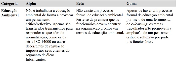 Verifica-se que, em Beta, não há qualquer iniciativa para se avançar no processo de educação na organização, transferindo toda a responsabilidade aos seus próprios colaboradores. Já os resultados em Alpha . Gama reforçam os argumentos de Demajorovic (2003) de que, em muitas empresas, quando a formação em educação ambiental existe, ela se restringe a treinamentos pontuais, como preparação para auditorias dos sistemas de gestão, em detrimento de treinamentos mais amplos abrangendo temas como: mudança climática, perda de biodiversidade, poluição, produção de energia com uso de carbono, pressão sobre a água e sobre alimentos, bem como impactos ambientais e econômicos (conforme defendido por Coleman, 2013).