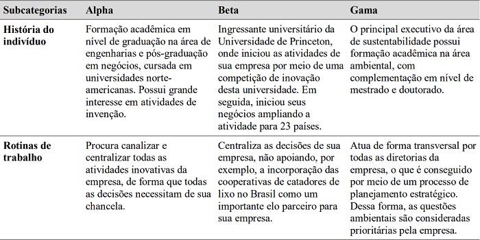 Este elemento de análise retrata a importância do papel desempenhado pelos empreendedores ou altos executivos e os gerentes das organizações, que por sua liderança favorecem o processo de aprendizado que resulte em inovação ambiental. Em relação ao papel exercido pelo empreendedor e a fim de facilitar a análise de dados, essa categoria foi dividida em subcategorias, conforme apresentado pela Tabela 7:
