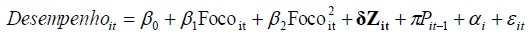 em que a variável dependente é o desempenho da firma i (i = 1, 2,…, n) no instante de tempo t (cada trimestre dos anos de 1995, 1996, 1998, 1999, 2001 e 2002). As variáveis explicativas são o foco (ou diversificação) da firma i no tempo t e seu quadrado (para representar a possível relação de U-invertido com o desempenho); o vetor coluna Zit contém os valores das variáveis de controle para a firma i no tempo t; Pit-1 controla o desempenho passado da firma i; α representa o efeito não observável relacionado à firma i; e ε é o erro idiossincrático.