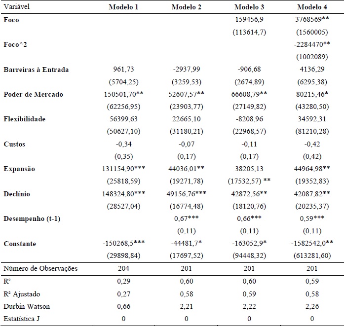 A Tabela 3 contém os resultados dos quatro modelos estimados para analisar a relação entre o foco e o desempenho no período avaliado. O Modelo 1 possui somente as variáveis de controle discutidas na revisão de literatura, mas sem a variável desempenho defasado em um período, ou seja, no mesmo trimestre do ano anterior; o Modelo 2 acrescenta a variável desempenho defasado como controle; o Modelo 3 contém a variável foco com relação linear com o desempenho, além de todas as variáveis de controle; o Modelo 4 é o modelo principal e apresenta a variável foco e seu quadrado para testar a associação em forma de U invertido do foco com o desempenho, além de todas as variáveis de controle.