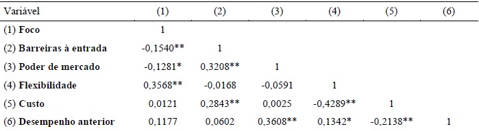 Também foram verificados os graus de correlação entre as variáveis explicativas (Tabela 4). É possível observar que o modelo não apresenta forte multicolinearidade (a maior correlação é de 0,4289, entre as variáveis custo e flexibilidade). Além disso, foram calculados os fatores de inflação da variância (FIV) e o maior deles foi igual a 2,19 (relacionado à explicação do market share em relação às outras variáveis explicativas). Como os FIVs não apresentaram valores superiores a cinco, que é o limite para indicar presença de multicolinearidade (Wooldridge, 2010), o modelo está isento desse problema.