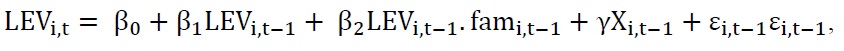 To analyze the specific effect of family ownership on speed, we include an interaction variable between the binary variable fam, which takes a value of 1 for family firms and 0 otherwise, as well as lagged leverage. The parameter of this interaction is β2, which indicates the partial effect of family ownership.