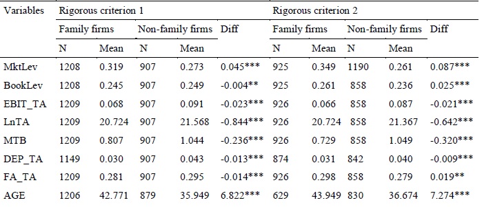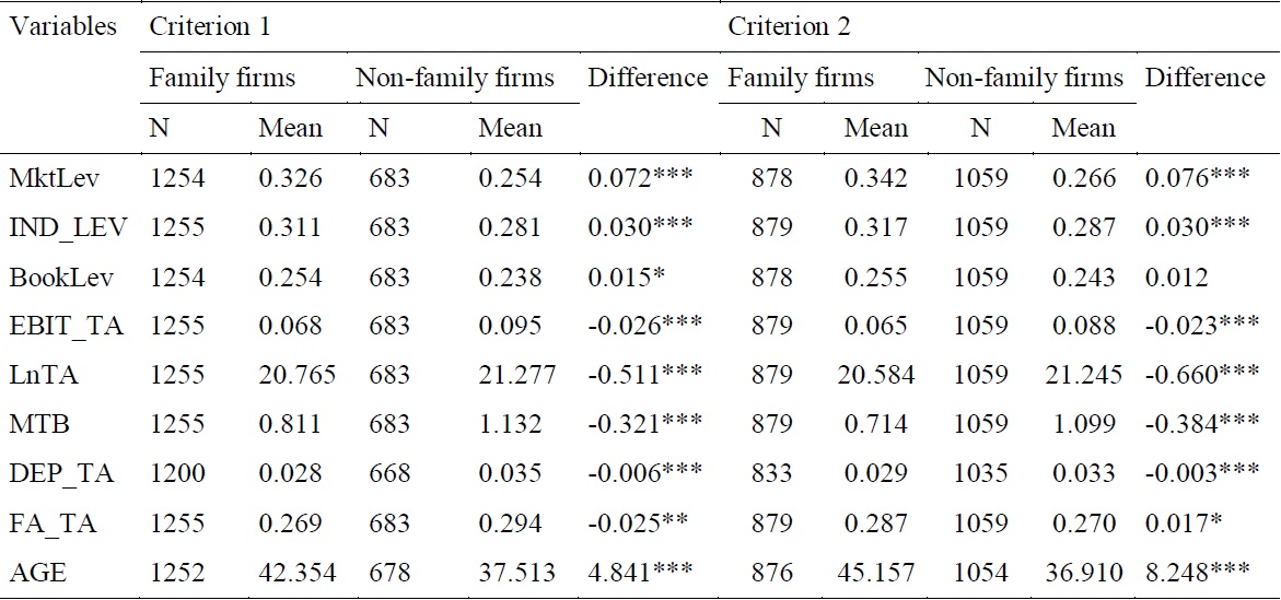 Table 1 indicates that, regardless of the criterion used, Brazilian family firms tend to be older, smaller, and less profitable; they invest less, have fewer growth opportunities, have fewer tangible assets, have a lower depreciation index, and are more leveraged than non-family companies. The differences in their market leverage, in particular, are significant at the 1% level. Family companies’ higher leverage is also reflected in their book leverage (but only by criterion 1 and at the 10% level), which is measured as the ratio of total debt to total assets. We can also see that family firms predominate in our sample if we use criterion 1 (that allows a firm to be familiar even if the family has small shareholdings). Not surprisingly, the number of family firms decrease when we use criterion 2, which demands that a family has the control of the firm.