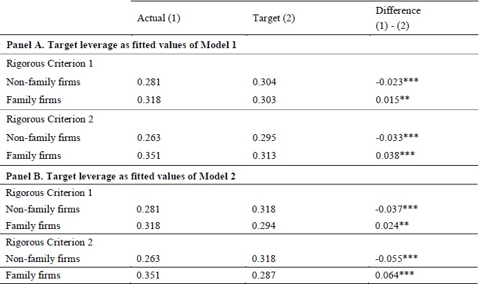 Table 4 shows the results related to the relationship between actual and target leverage of family and non-family firms, demonstrating that family companies are significantly overleveraged, whereas non-family companies are significantly underleveraged.