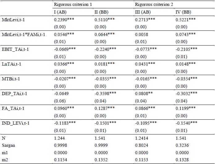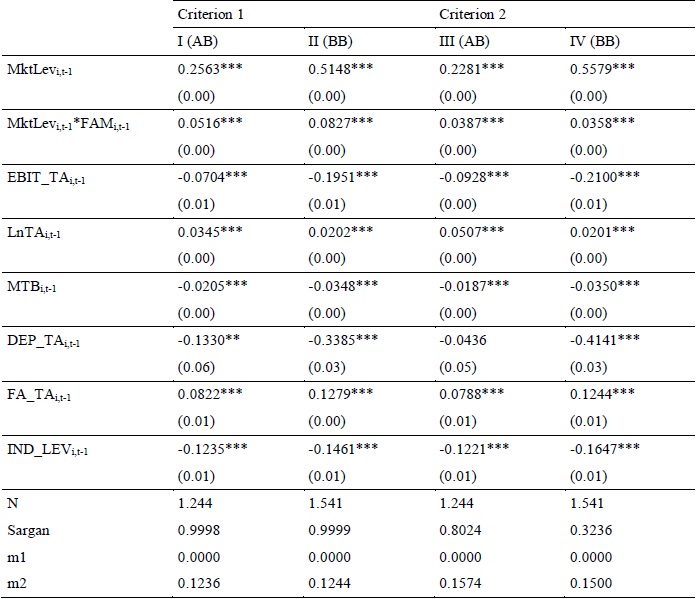 Table 6 provides the results of the partial adjustment model of equation 5. The parameters in columns I and II refer to firms whose LUS is a family, and the coefficients in columns III and IV refer to firms whose LUS is both a family and the controlling shareholder. The coefficients in the odd columns were estimated by applying the difference GMM introduced by Arellano and Bond (1991) – henceforth AB – while the coefficients in the even columns were estimated by applying the system-GMM introduced by Blundell and Bond (1998) – henceforth BB. The results are consistent with our second hypothesis that family companies adjust to their target leverage significantly slower than non-family companies do.