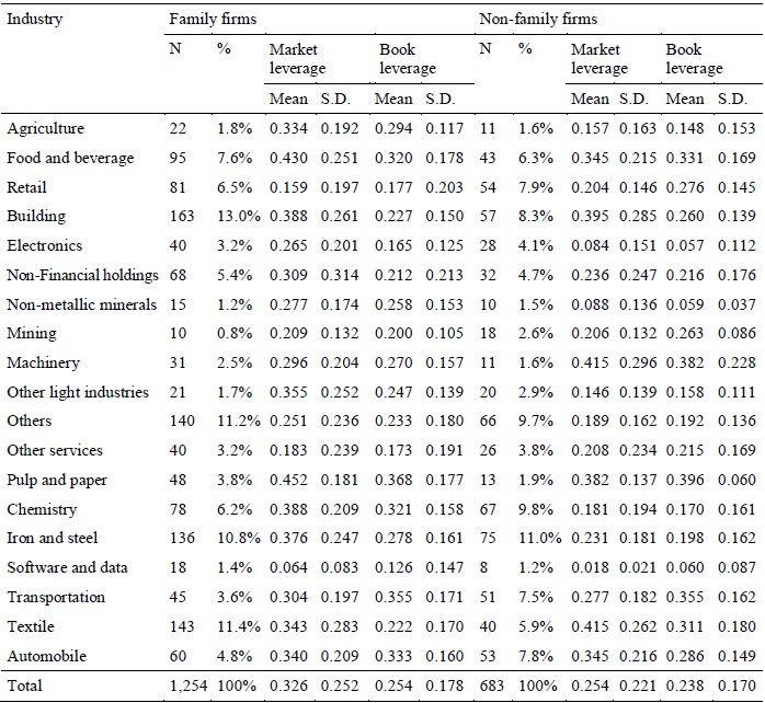 Table 2 shows the descriptive statistics of market and book leverages by industry (following Economatica classification), according to our criterion 1. To save space, we do not report the results using criterion 2, but they are similar. Except for banking and utilities, which are excluded from our analyses, one can see that our sample comprises firms from a wide range of industries. In addition, the distribution of family and non-family firms across these different industries seems to be proportional. Thus, it is unlikely that our main results stem from industry bias.